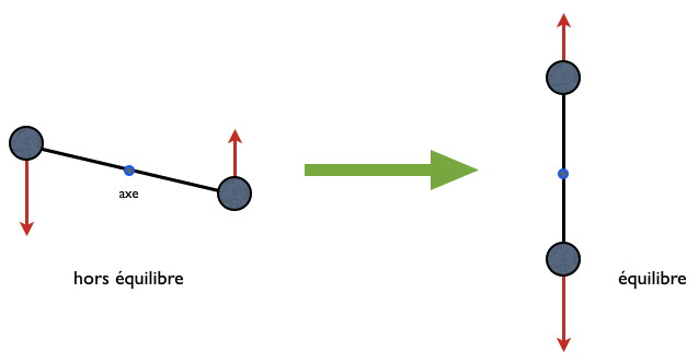 Ce que tu décris là, pourrait se dessiner ainsi (à gauche) : Une force dans un sens sur une extrémité, et l'autre force dans l'autre sens à l'autre extrémité. Le résultat est que ce système va évoluer vers une position d'équilibre (à droite), où tout deviendra immobile.