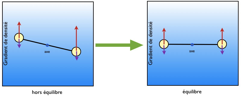 Imaginons une autre situation : un axe avec deux objets de même masse (poids ici en violet, vers le bas), mais plongés dans un liquide avec un gradient de densité (plus dense en bas, moins dense en haut). Alors la poussée d'Archimède (ici en rouge, vers le haut) n'est pas identique sur les deux objets, donc l'axe va se mettre à tourner. Mais arrive un moment où les deux objets sont soumis à la même densité, alors les poussées deviennent identiques. Et on retombe sur un équilibre des forces...