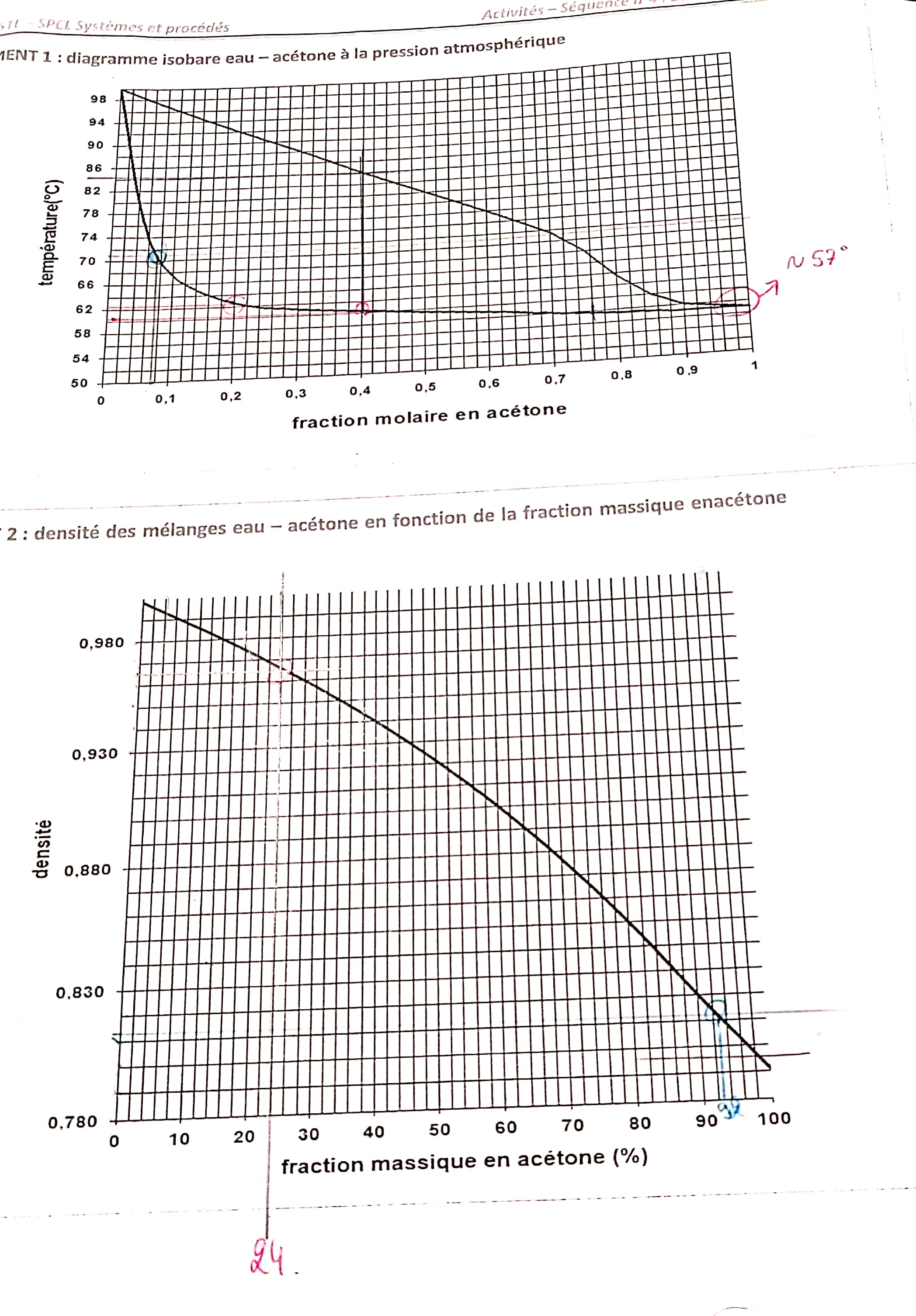 Il faut repérer cette densité sur l'axe vertical du diagramme du bas, tirer un trait horizontal jusqu'à la courbe, et au point d'intersection, descendre verticalement pour lire la fraction massique (notée $ x'_{acétone} $) d'acétone. Je vois que tu as déjà fait ce trait et trouvé la valeur 24%. On serait plutôt à 25% si on regarde bien.