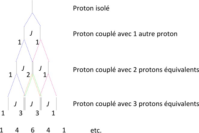 A chaque fois que l'on ajout un proton couplé avec le proton que l'on est en train d'étudier, cela scinde le signal en 2 signaux (constante de couplage J entre les 2). J'ai indique en couleur les séparations pour chaque signal. Les nombres représentents les intensités relatives (que l'on retrouve grâce au triangle de Pascal).