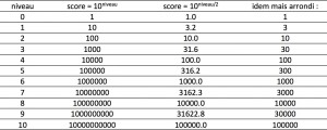 Alors les concepteurs qui ont bâti ces modèles au départ ont dû prendre la relation suivante : $ score = 10^{\frac{niveau}{2}} $
