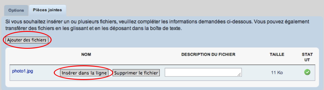 Puis choisir "Ajouter des fichiers", et une fois que c'est fait, "Insérer dans la ligne" pour que l'image soit intégrée au message :